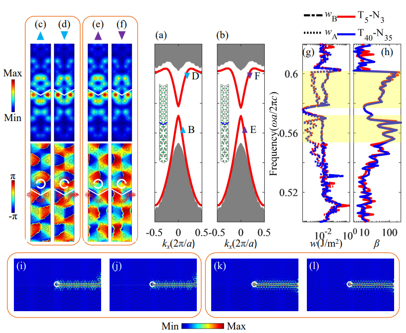 近年来,二维拓扑赝自旋光子晶体中的螺旋边界态引发了人们广泛关注。螺旋边界态的特点在于能实现光波的无损耗单向传输,这为光通信和光计算带来了革命性的应用前景。在此项研究中,课题组以几种不同形状的正多边形棱柱构成的二维C6对称光子晶体为基础,通过巧妙的设计,部分替换光子晶体原胞中的正多边形棱柱,设计了类C6对称光子晶体(如图1b和图1c所示)。数值计算表明,即使在C6对称性破缺的类C6对称光子晶体中,通过调整棱柱的大小,不同种类的光子晶体也可以形成相似的能带结构(如图1d-1f和图2所示)。将这些C6对称和类C6对称光子晶体沿zigzag边界拼接可以构建近似相同的螺旋边界态。通过考察这些螺旋边界态的传输特征,课题组证明了它们具有相同的单向传播特性(如图3所示)。研究结果表明,二维拓扑赝自旋光子晶体中螺旋边界态的形成和性质仅由界面两侧光子晶体的拓扑能带结构和拓扑赝自旋性质决定,而与实际空间中光子晶体中散射体的形状无关。课题组的研究为进一步理解螺旋边界态的形成提供了依据,并为实践中拓扑边界态的调控提供了理论支撑。