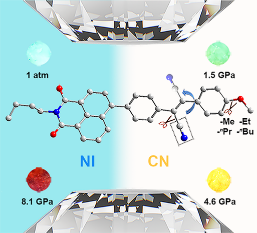 2. 刺激响应型有机智能发光材料的在发光器件、传感、信息防伪加密等领域具有广泛的应用前景。控制分子精细结构,提升力敏发光位移,一直是该领域的重要议题。团队采用萘酰亚胺和氰基二苯乙烯制备系列给-受体力敏智能发光分子。系列材料在宽达10GPa的压力范围内,展现出了显著的荧光颜色变化。同时,利用区域选择性氰化进一步实现精确的分子构型调控,有效地扩大荧光峰位的移动速率,促进材料力敏应用。该研究不仅揭示了有机给-受体分子的压致变色机制,还为设计、合成具有优异性能的力敏有机发光材料提供了新方法。相关研究成果以“Developing Piezochromic Luminescent Materials via Regioselective Cyanation of Naphthalimide Cyanostilbene Derivatives(利用萘二酰亚胺氰基联苯衍生物的选择性氰化开发压致变色荧光材料)”为题发表在期刊《Materials Chemistry Frontiers》(《材料化学前沿》,中科院二区,影响因子6.0)上。2022级硕士研究生贾浩为论文第一作者,beats365唯一官网入口官网李茜教授、李磊教授与安徽大学王宬元教授、杨家祥教授为共同通讯作者,beats365唯一官网入口官网为第一署名单位。