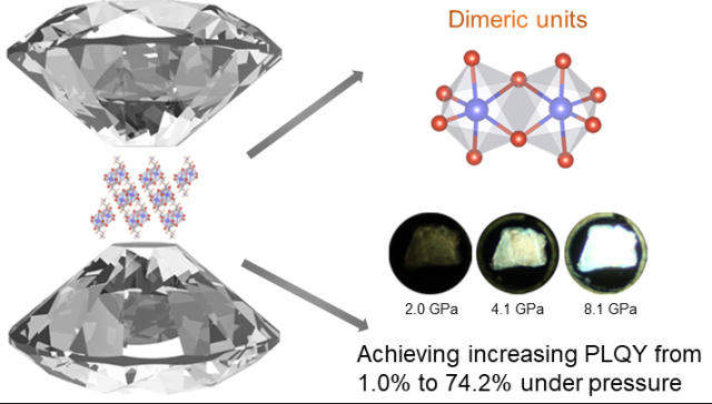 3. 在各种构型的金属卤素配位基元中,八面体二聚体单元具有较大的结构灵活性。基于此,团队针对零维金属卤素钙钛矿(C3H12N2)2Sb2Cl10进行高压研究。一方面利用压致二聚体构型扭曲增强电—声耦合效应,促进激子自陷,增强能量势垒和活化能,使更多的自陷态激子被束缚在三重态,并进行辐射跃迁。另一方面,利用压致激发态弛豫受限引起非辐射跃迁的显著降低,促进荧光效率的提升。高压下,材料的荧光量子产率从<1.0%显著提高到了74.2%,并显示出强烈的宽带白光发射。这项工作以“Pressure-Triggered Intense Natural White Emission via Controllable Distortions of Antimony Chloride Dimers(压致可控氯化锑二聚体畸变实现强白光发射)”为题发表在期刊《Chemical Engineering Journal》(《化学工程杂志》,中科院一区,影响因子13.3)上。2022级硕士研究生尤照江为论文第一作者,beats365唯一官网入口官网李茜教授、王凯教授和泰山公司陈君教授为共同通讯作者,beats365唯一官网入口官网为第一署名单位。