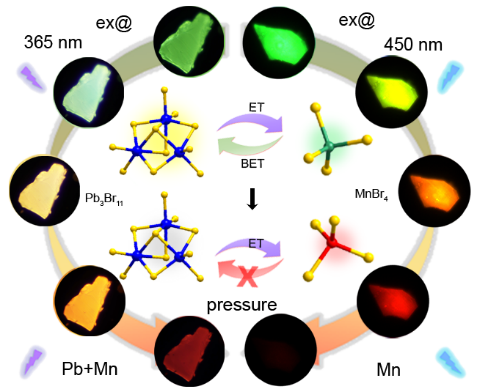 5. 零维金属卤素钙钛矿的光敏基元能够在分子尺度完全为阳离子所间隔。基于此,团队将零维研究体系向多光敏基元过度,探索不同光敏基元间的能量转移在高压下的响应行为,发展金属卤素钙钛矿的多重荧光特性。零维金属卤素钙钛矿(C9NH20)9[Pb3Br11](MnBr4)2具备[Pb3Br11]5和[MnBr4]2-两种不同的光敏结构基元。随着压力的升高,[Pb3Br11]5结构刚性增强且构象畸变被抑制,有效改变了自陷态激子的发射平衡,导致对应自陷态激子荧光峰的异常蓝移。同时,[MnBr4]2-的结构收缩显著增强了Mn2+的约束效应,有效提升了其本征发光效率。值得关注的是,在激发光能量足够高的条件下,[Pb3Br11]5-可以作为“天线”来进一步增强Mn2+的发光强度,引起材料明显的激发依赖荧光现象。相关研究成果以“Resolving multiple emissions of zero-dimensional heterometallic halide hybrid via pressure-triggered antenna effect(压力诱导天线效应解析零维双金属卤化物的多重发光特性)”为题发表在期刊《Materials Research Letters》(《材料研究快报》中科院一区,影响因子8.6)上。2022级硕士生孟新淼为论文的第一作者,beats365唯一官网入口官网李磊教授、王凯教授和李茜教授为共同通讯作者,beats365唯一官网入口官网为第一署名单位。
