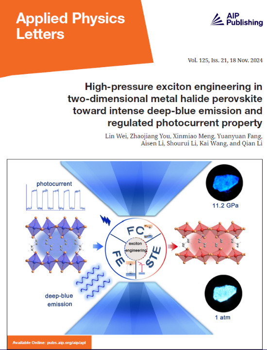 6. 二维金属卤素钙钛矿中兼具高维与低维金属卤素钙钛矿的不同结构特性。针对二维金属卤素钙钛矿10% Pb²⁺掺杂BDACdBr₄(BDA:1,4-丁二胺)体系,团队通过高压手段调控激子行为,有效优化材料的光致发光和光电流特性。高压下,相互作用较弱的层间结构被显著收缩,电-声耦合作用降低且激子结合能减小,限制激子的系间窜跃,更多光生激子以自由激子形式返回基态。材料自陷态激子发光逐渐减弱,且自由激子发光逐渐增强。随着压力继续升高,常压结构转为高压相,激子结合能的进一步降低使得激子一方面以自由激子形式辐射跃迁,引起强烈深蓝光发射。同时,光生激子还会发生解离,促进自由电荷迁移引起光电流效应的增强。相关研究成果以“High-pressure exciton engineering in two-dimensional metal halide perovskite toward intense deep-blue emission and regulated photocurrent property(二维金属卤素钙钛矿的高压激子调控:强深蓝光发射与光电流性能调制)”为题发表在期刊《Applied Physics Letters》(《应用物理快报》,中科院二区,影响因子3.5)上,并被选为封面文章。2023级硕士研究生魏林为论文第一作者,beats365唯一官网入口官网王凯教授、李茜教授和中国工程物理研究院流体物理研究所李守瑞副研究员为共同通讯作者,beats365唯一官网入口官网为第一署名单位。