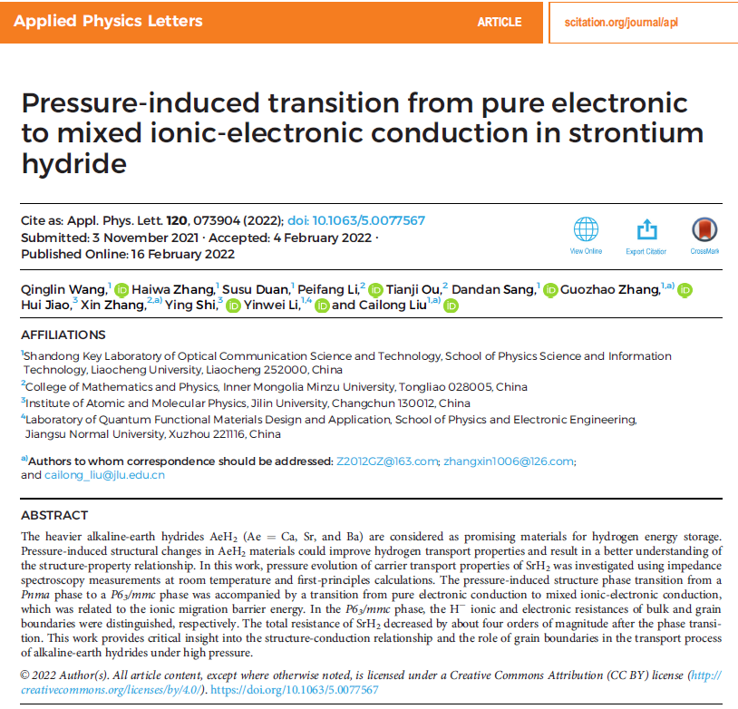 近日,beats365唯一官网入口官网/山东省光通信科学与技术重点实验室刘才龙教授团队在碱土金属氢化物SrH2高压下的载流子输运行为研究方面取得重要进展,研究成果以“Pressure-induced transition from pure electronic to mixed ionic-electronic conduction in strontium hydride”为题发表在物理类权威期刊《Applied Physics Letters》(中科院二区Top期刊,Nature Index收录)上。王庆林副教授为论文第一作者,张国召博士、刘才龙教授为论文通讯作者,beats365唯一官网入口官网为第一通讯单位。