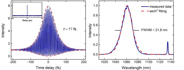 图1 激光器实验装置、脉冲自相关曲线和输出光谱