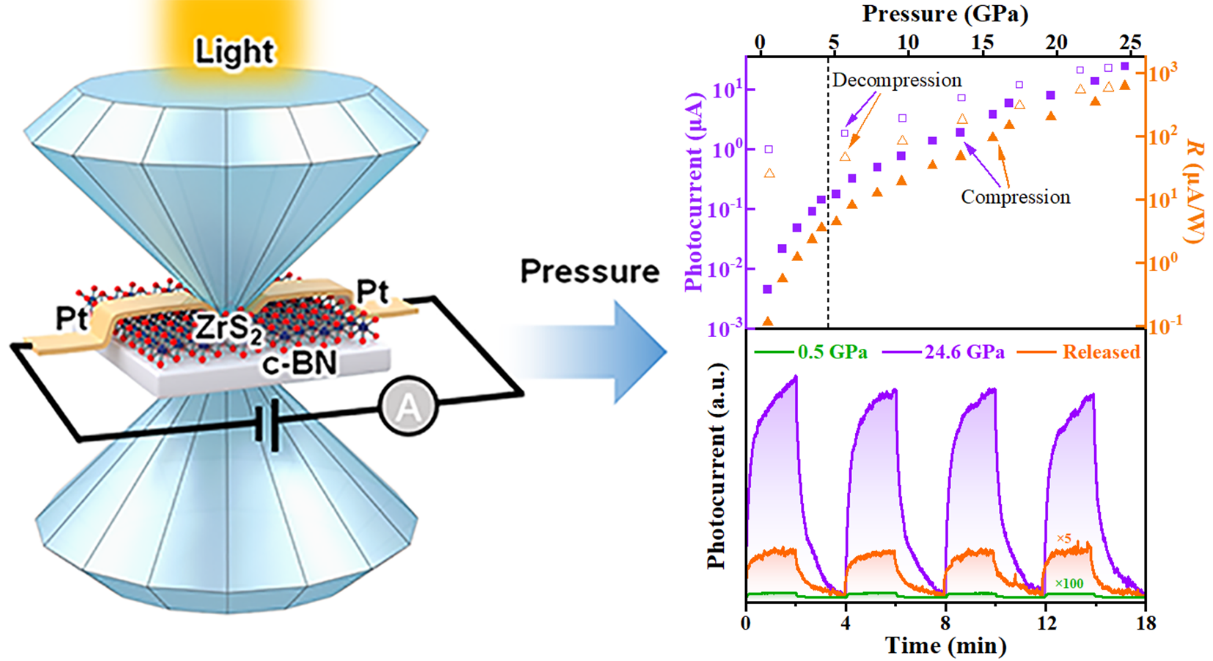 压力可以通过调控材料的晶体结构,进而实现对材料光电性能的调控。ZrS2作为一种典型的过渡金属硫族化合物(TMDs),相比于被广泛研究VIB族TMDs,理论上具有更优异的电子和光电性质,且在光电探测器、场效应晶体管和传感器等领域具有巨大应用潜力。作者们利用基于金刚石对顶砧的高压原位光电流、拉曼散射光谱、交流阻抗谱、吸收光谱的测量手段和理论计算方法相结合系统地研究了高压下层状ZrS2的光电性质。研究表明,加压过程中,随着压力的增加,层状ZrS2的光电流值持续增加,最终其光电流实现了三个数量级的增加;且拥有高光电响应的ZrS2高压相可以截获至常压。ZrS2的晶体结构、电输运性质和禁带宽度也均受压力调控。此项研究为科研工作者通过高压合成性能优异的TMDs光电功能材料提供了新的思路,对未来光电器件性能的提升具有重要意义。公司2021级硕士生王娜和张国召博士为共同第一作者,冯振豹副教授、张海娃博士和刘才龙教授为共同通讯作者,beats365唯一官网入口官网为第一署名单位。