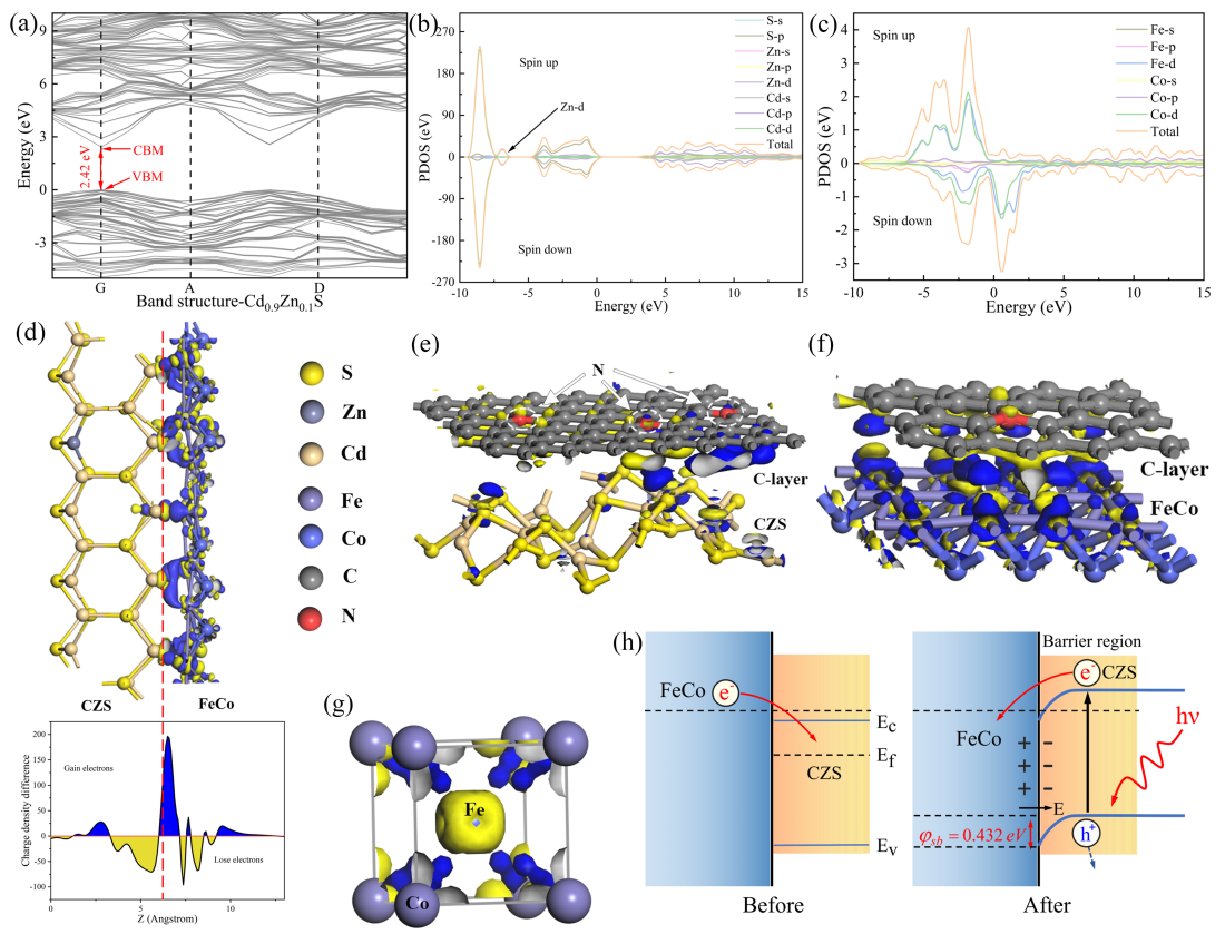N原子掺杂石墨碳层包裹的磁性FeCo纳米材料与其它半导体材料形成异质结的过程中,电子转移机理的解释是一个难点。本文首次提出利用肖特基势垒理论解释这个问题,有效地阐明了电子转移过程的机制。Cd0.9Zn0.1SCZS)作为一种极具潜力的可见光活化光催化剂,但其受到光激发载流子分离的慢动力学的限制。基于第一性原理的密度泛函理论(DFT)计算表明,引入掺氮石墨碳(FC@NC)可以有效降低氢的吸附自由能,从而加速CZS的氢反应动力学。在理论预测的支持下,通过沉淀和煅烧成功制备了磁性FC@NC纳米颗粒,然后通过超声自组装和煅烧,再CZS结合,形成了FC@NC/CZS复合光催化剂。基于实验结果和DFT计算,提出了利用肖特基异质结增强FC@NC/CZS复合材料光催化活性的可能机理。该工作是一个具有代表性的理论指导材料合成的成功案例。