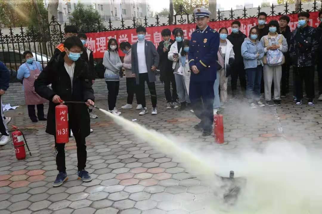 在讲座中,修主任从消防设备的使用方法和发生火灾后的逃生方法出发,借助自身从业经历,警醒同学们火灾的高发性和危险性。修主任结合校园火灾实际案例与火灾事故视频,对校园火灾产生的原因进行剖析,对案例中暴露的问题进行分析解答,以此引起同学们对火灾事故的思考,敲响同学们心中消防安全的警钟。 修主任向同学们介绍并演示了干粉灭火器的正确使用方法,向同学传授灭火器的使用要领,指导同学们进行干粉灭火实地操作,使同学们将理论知识付诸于实践之中。