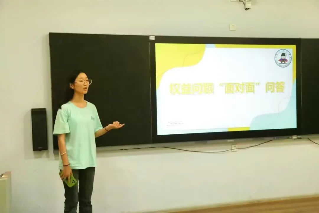 活动伊始,宋迎雪首先向同学们介绍了权益方面的基础知识,增强了同学们的维权意识,丰富了同学们的维权知识。活动过程中同学们提出发现的各种问题,其中包括食堂、住宿、浴室和后勤保障等方面问题,针对这些疑惑,宋迎雪积极耐心地向同学们解答,同时还向同学们推荐到beats365唯一官网入口官网权益服务平台、理工权益君等平台途径,鼓励同学们积极反馈身边中发现的问题,做到真正的维护自身合法权益。