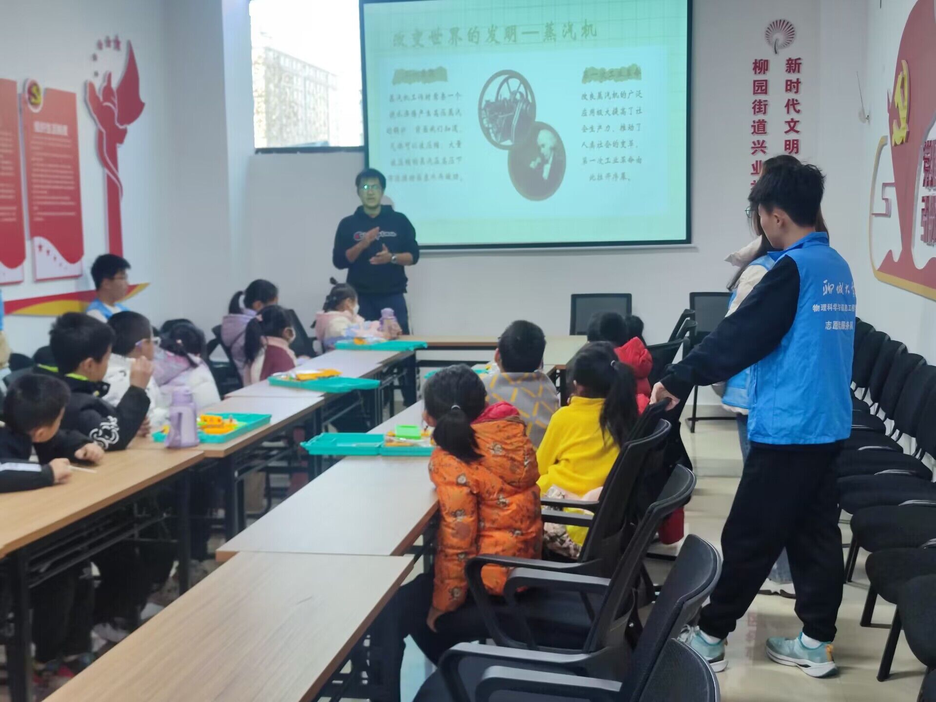 在本次课程中,志愿者们用提问互动的形式活跃课堂氛围,激发小朋友在课堂中的积极性,为大家详细讲解了什么是固体、液体、气体以及其具有哪些特点,运用生活中常见的例子,让小朋友们形象直观地了解不同性质的物质。在此基础上,志愿者们还介绍了雾的形成和蒸汽机的工作原理,拓宽了小朋友的科学视野。课程进行中,志愿者们开展了拓展试验——趣味电路迷宫,鼓励小朋友们在游戏中学习,在合作中进步。接下来志愿者们以有趣的光现象,激发小朋友们的好奇与兴趣,引起大家的思考,为小朋友们讲述了如何判断光源、光的特性以及光对人类生活的重要性。课程结束后,志愿者们为鼓励小朋友们积极探索,为大家发放了课程积分卡。