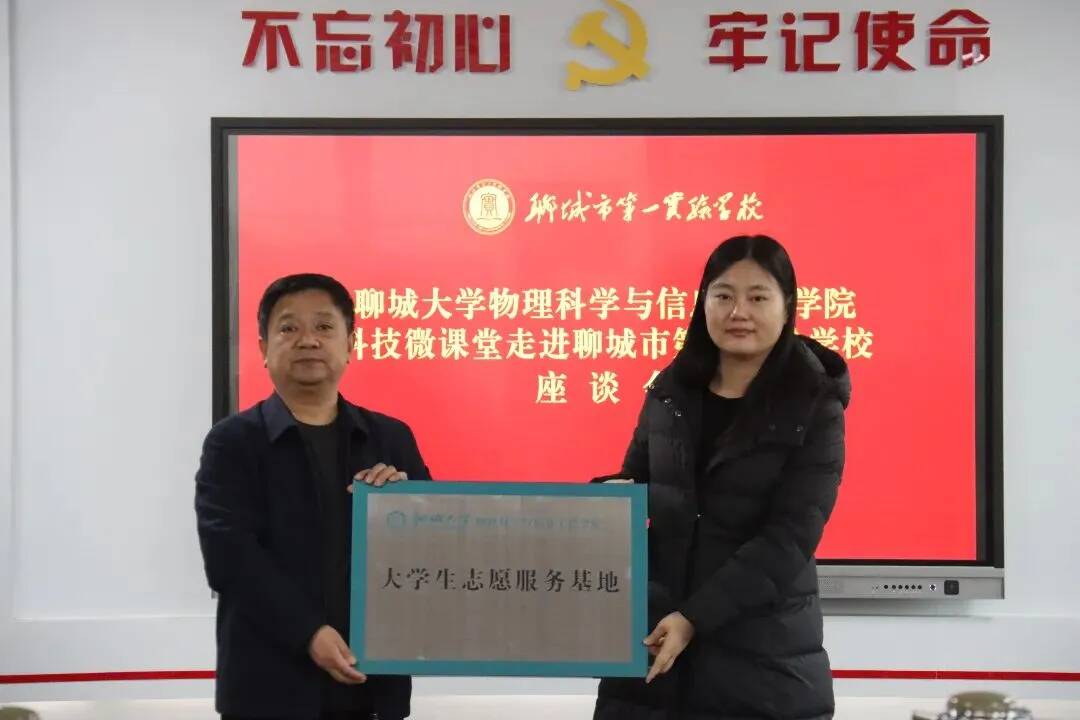 会议伊始,边传顺首先对公司科学学科课程开展、科学实验室建设、科技人才培养方案等方面进行了阐述,洪文静对公司历史、团队力量、科研设备等情况作了介绍,并表示希望与聊城市第一实验中学深挖志愿服务空间、创新志愿服务机制、提升志愿服务层次,实现中学教育与大学教育的良性互通。随后,边传顺与洪文静为志愿服务基地授牌。