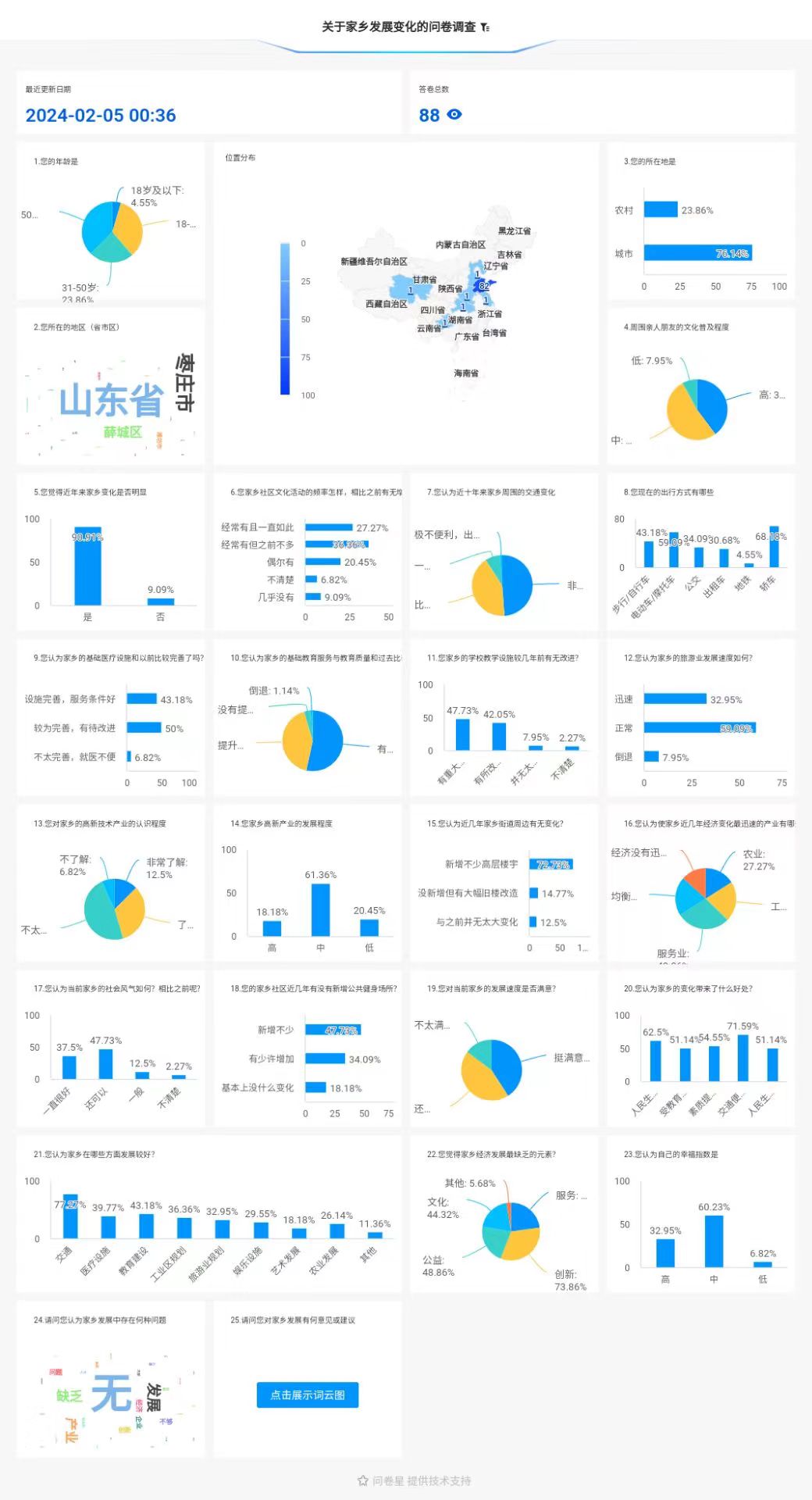 探索乡情、振兴发展队在调研之初,首先锁定了调研的核心领域,包括经济建设、教育发展和医疗卫生等关键方面。为了确保调研的准确性和全面性,队员们结合了线下交流和线上调查的方式,深入了解了家乡的基本情况。在此基础上,队员们设计了一套详尽的调查方案和问卷,不仅涵盖了居民对当地经济、社会、文化的直观感受和建议,还深入挖掘了他们对未来发展的热切期望。随后,同学们通过网络平台将问卷广泛发放给家乡的居民,同时辅以电话、视频等在线访谈形式,与居民进行了深入的交流;在收集到足够的数据后,队员们通过统计和分析问卷结果,发现了家乡在发展中存在的一些问题,如环境污染、教育资源不均衡等;最后根据数据分析的结果,撰写了详细的调查报告,报告中呈现了当地社会经济发展的现状和问题,并提出了相应的建议和措施。