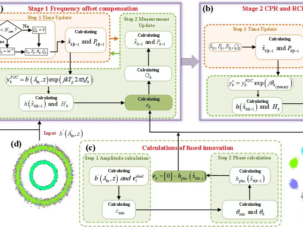 近日,许恒迎教授团队在非线性频分复用光纤传输系统领域取得进展。该研究成果以“Joint equalization of frequency offset and phase noise using two-stage cascaded extended Kalman filter for discrete spectrum 16/64APSK NFDM systems”(“基于两阶段扩展卡尔曼滤波器的离散频谱非线性频分复用系统频偏和相位噪声均衡方案”)为题,发表在光学领域权威期刊《Optics Express》(《光学快报》,中科院2区期刊,影响因子3.8)。