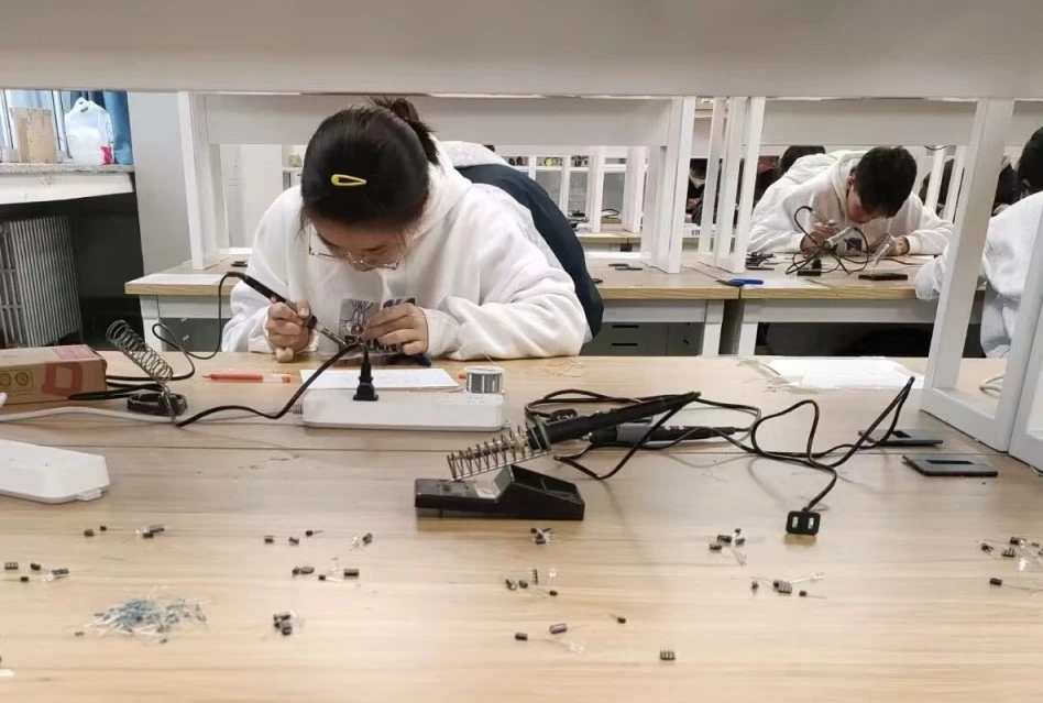 比赛开始之前,参赛选手们在场外蓄势待发、跃跃欲试,各组相关负责人仔细检查并分发比赛所需的元件,以确保比赛的顺利进行。比赛开始时,负责人对比赛的电路图和各类元件进行了详细说明,同时介绍了比赛的规则和评分标准。在紧张而激烈的氛围中,选手们运用高超的焊接技术将零件连接在一起,完成了他们的创作。这项技术对精确性和专业水平要求极高,选手们展现出了扎实的技艺和卓越的实践能力。他们凭借稳定的手势和精准的焊接技术,将设计转化为了真正的作品。比赛结束后,评审团对每位选手的作品功能实现、焊接技术、完成程度以及作品效果等方面进行了公正客观的评分。