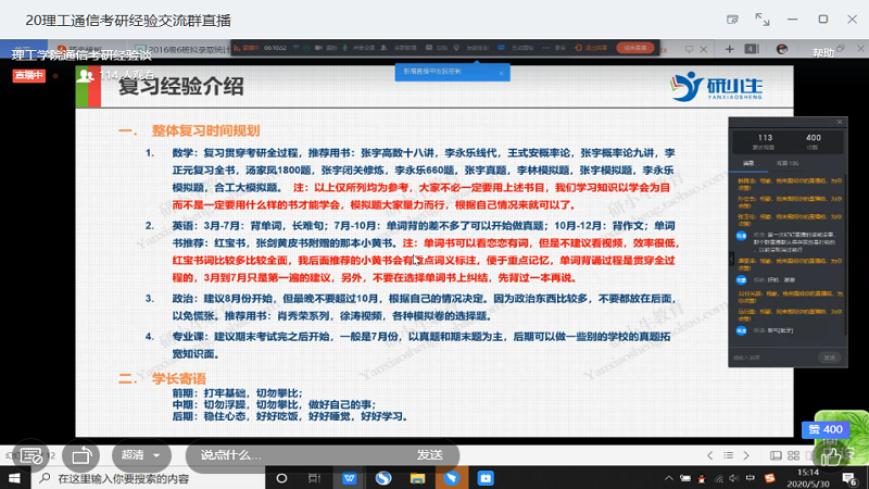 本次会议通过钉钉进行线上交流,四位主讲人讲述了自己的备考过程,以及学习资料的选择与应用,给备考员工提供了一个可供参考的学习过程。在简单介绍20届本次考研上岸的情况后,考取西南交通大学的王泽文开始讲述自己的学习经验,并推荐了备考资料以及在不同时间段的使用方法。他强调,备考过程中的时间分配及其重要,每一科都必须分为巩固基础,强化和复习三个阶段,让与会同学们深入了解了备考过程。紧接着,考取南京邮电大学的李旭冉针对如何复习数学和英语的问题向同学们热情洋溢地分享起自己的复习过程,多做真题,回归课本,合理安排时间,每一个要点都让与会员工受益匪浅。