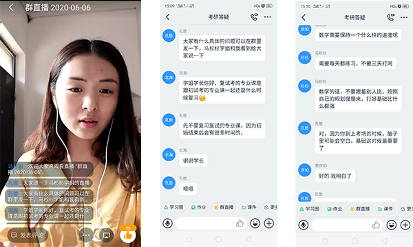 考取西安电子科技大学的孔哲用一个问题打开了话题:至少看懂百分之几的单词才能看懂文章?他表示,在考研英语方面,词汇是重中之重,至少读懂95%的单词,并长期练习,理解单词在文章中的意思,才能看懂一篇文章,阅读是考研英语中的重要部分,阅读拿高分了,其他部分也低不了。随后,他详细地分享了四门科目的学习方法和推荐的学习资料。他强调,一定要多看课本,多刷真题,平时期末试题也不能忽视,一定要规划好时间安排,并坚持下来,就一定能取得一个不错的成绩。考取南京邮电大学的马杉杉着重分享了她在数学方面的经验,她强调:基础一定要打牢,做真题时分模块进行,同时要注重计算,牢记基本概念,做题要注重思路。关于时间分配问题,她表示:不同的人时间分配都不同,但是一定要充分利用,早上可以多背一些英语或者政治,中午和下午以数学和专业课为主,晚上则可以看看政治的视频。