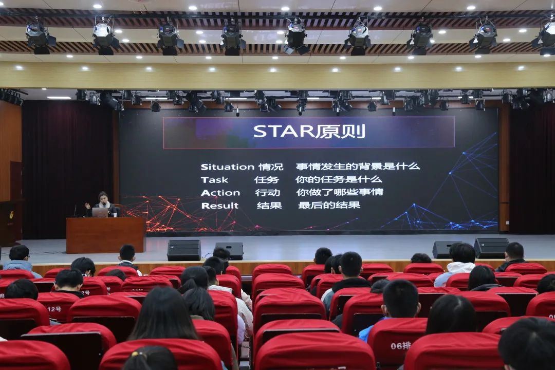 李召华从结构化面试、无领导小组面试两种面试形式入手,多维度多视角的讲述面试技巧,细致入微的为同学们展示阐明了什么是正确的求职之路。讲座中,李召华着重强调了“STAR原则”对于面试的作用,提出了面对面试套路的小技巧,让同学们看到了自己未来求职就业的无限潜力和可能。