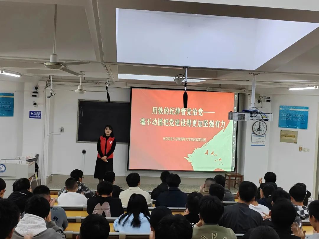 以学铸魂、以学增智、以学正风、以学促干。活动开始,惠亨昀以四个“为什么”引发同学们的思考,随后带领同学们展开对本次宣讲内容的学习。执纪者必先守纪,律人者必先律己,为了使同学们更加深入理解习近平总书记关于全面从严治党的重要论述,惠亨昀从“党的精神”、“党的建设”、“党的队伍”以及“党的作风”四个层面进行了由浅入深地细致讲解,并带领同学们观看短片《永远在路上》。整个宣讲过程中同学们都全神贯注,积极配合宣讲人的工作,认真学习并感悟党的“四铁精神”。宣讲结束后,马克思主义公司时政宣讲团成员与同学们进行合照留念,给本次宣讲活动画上了一个圆满的句号。