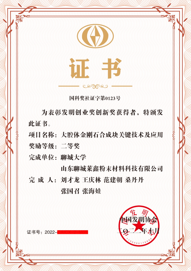 近日,中国发明协会公布了2022年发明创业奖创新奖获奖情况,公司泰山学者青年专家刘才龙教授团队联合山东聊城莱鑫粉末材料科技有限公司合作申报的“大腔体金刚石合成块关键技术及应用”成果获中国发明协会2022年度“发明创业奖创新奖”二等奖。聊城大学为第一获奖单位。