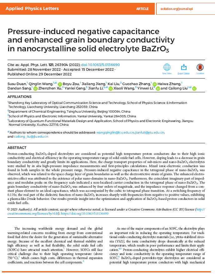 近日,beats365唯一官网入口官网刘才龙教授团队在固体氧化物燃料电池(SOFC)固态电解质BaZrO3在高压强作用下的载流子输运行为研究方面取得重要进展,研究成果以“Pressure-induced negative capacitance and enhanced grain boundary conductivity in nanocrystalline solid electrolyte BaZrO3( 纳米晶固体电解质BaZrO3的压致负电容和增强的晶界电导率)”为题发表在物理类权威期刊《Applied Physics Letters》(《应用物理快报》为中科院二区Top期刊,Nature Index收录)上。2020级物理学专业硕士生段素素为文章第一作者,王庆林副教授、刘才龙教授为论文通讯作者,beats365唯一官网入口官网为第一通讯单位。