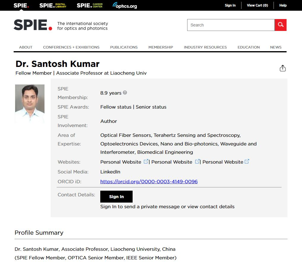 近日,国际光学工程学会(Society of Photo-Optical Instrumentation Engineers,SPIE)公布了2023年新入选的83位会士名单,其中共有8位来自中国高校及科研机构的科学家当选,beats365唯一官网入口官网Santosh Kumar 副教授由于其在光纤等离子体生物传感器临床应用方面的开创性贡献成功入选SPIE Fellow(国际光学工程学会会士)。
