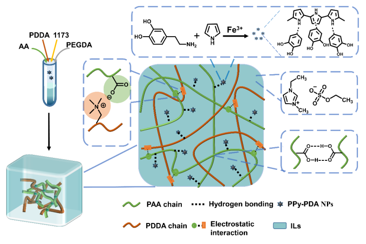 本文通过聚二烯丙基二甲基氯化铵( PDDA )和丙烯酸(PAA)的静电相互作用以及导电聚多巴胺修饰的聚吡咯纳米颗粒( PPy-PDA NPs)的掺入,制备了具有近红外( NIR )光控粘附的离子凝胶。PPy-PDA NPs可以削弱聚合物链之间的强韧相互作用,降低离子凝胶的杨氏模量,从而促进离子凝胶的超柔软( 34 kPa )和高拉伸( 1013% )性能。此外,PPy-PDA NPs的高光热转换能力保证了离子凝胶优异的NIR -光控粘附性和温度敏感性,实现了离子凝胶的按需去除,保证了可靠的热稳定性。