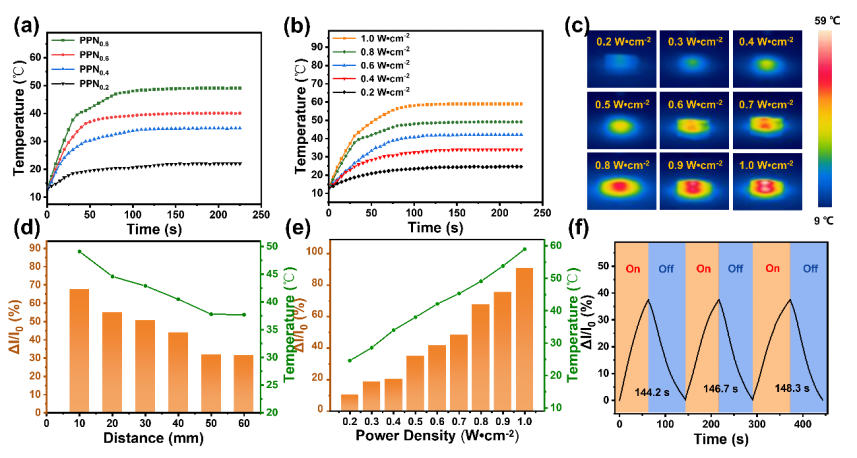 图3. PPN离子凝胶对近红外光的响应。( a )不同PPy-PDA NPs含量的PPN离子凝胶在激光照射下的升温过程。( b ) PPN离子凝胶在不同功率密度( 0.2~1.0 W·cm2)下的升温。( c )不同激光功率密度下的热像图。( d )不同辐照距离下的温度和相对电流变化。( e )不同功率密度下温度和相对电流的变化。( f )连续三次ON-OFF循环的响应时间。
