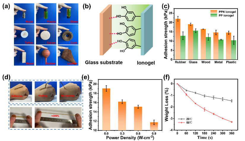 图4. PPN离子凝胶的粘附性能。( a ) PPN离子凝胶在不同基底上的粘附性能。( b ) PPN离子凝胶与玻璃的粘附机理。( c ) PPN和PP离子凝胶与不同材料的粘附性能比较。( d ) PPN离子凝胶与皮肤的粘附照片。( e )不同功率密度的近红外光下PPN在玻璃上的最大搭接剪切强度。( f ) PPN离子凝胶分别在20 °C和50 °C保存后的溶液保持能力。