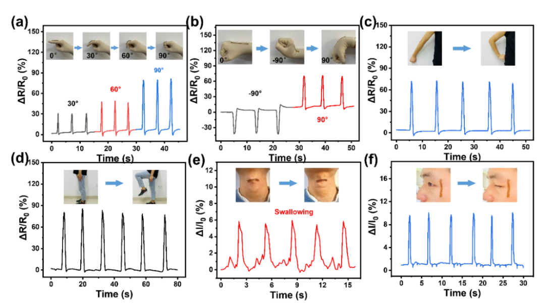 图8. ( a )手指分别在30 °、60 °和90 °弯曲时离子凝胶传感器的压阻响应。( b )腕关节两个方向弯曲时的相对电阻变化。( c、d)对手臂弯曲和膝关节弯曲的电阻响应曲线。( e , f)咽喉吞咽和眨眼的电流响应曲线。
