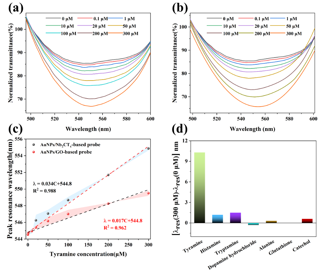 在这项工作中,研究人员开发了一种基于Nb2CTx MXene增强的双S锥光纤(DSF)结构LSPR传感器探针,用于实现酪胺浓度检测。与传统的锥形光纤相比,DSF结构可以在传感区域提供更强的倏逝场以激发LSPR。研究者们分别利用金纳米粒子/氧化石墨烯/酪氨酸酶(AuNPs/GO/酪氨酸酶)和AuNPs/Nb2CTx/酪氨酸酶在传感器区功能化,开发了两种不同DSF结构的探针,并对比了不同酪胺浓度下传感器的峰值共振波长漂移量。实验结果表明,Nb2CTx增强的传感器探针具有更高的灵敏度和更好的线性拟合度,在0-300 μM酪胺浓度范围内,探针的灵敏度和检测限分别为34 pm/μM和0.352 μM。本工作为增强LSPR作用和提高LSPR传感器灵敏度提供了研究平台。