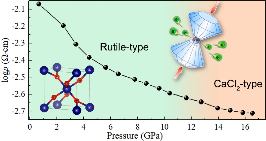 CrO2是典型的半金属铁磁材料,费米能级具有接近100%的自旋极化,已广泛应用于磁记录材料和自旋电子器件,如磁记录头、磁存储器、磁传感器和自旋晶体管等。本工作中,基于课题组自主搭建的变温高压原位霍尔效应测量系统,获取了CrO2电阻率(如图1所示)、磁阻、霍尔系数和载流子迁移率等参量随压力的演化关系,结合第一性原理计算,揭示了高压下半金属铁磁体CrO2的磁学性质和电输运行为。研究结果表明,压力诱导的结构相变会导致CrO2的霍尔系数、载流子浓度和迁移率发生不连续变化,而载流子浓度的降低和迁移率的增加,导致电阻率随着压力增加而连续性降低。此外,在外加磁场(0∼±15KOe)下,CrO2表现出线性负磁阻效应,由于压力对双交换机制的影响,线性负磁阻对称性随着压力的增加逐渐变差。该研究结果对于深入理解半金属和铁磁材料的输运机制提供了新思路。