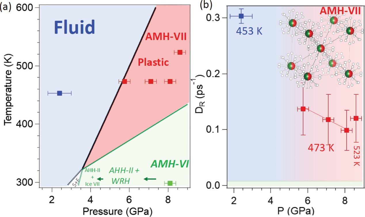 图 1(a)AMH温度-压力相图;(b)不同温度下,旋转扩散系数随压力的变化关系