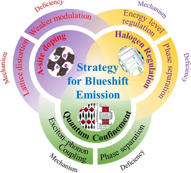蓝色钙钛矿发射材料因其诱人的光电性能而受到广泛的研究。在这篇综述中,我们重点介绍了蓝色钙钛矿研究的最新进展,并为解决未来研究的主要挑战提供了一个合理的策略。本文通过卤素调制、离子掺杂和量子限制等方法全面讨论了钙钛矿晶体蓝移发射的关键策略。并详细总结了近年来不同类型钙钛矿的研究进展,如3D、2D/准2D、NCs、器件结构等。我们提出了膜形态和高缺陷密度对限制三维钙钛矿膜有效发射的影响。然后,我们通过组成调制、相位调制工程、缺陷钝化和功能层设计的基本策略,阐述了蓝色PeLEDs对高效发射和稳定性的积极影响。同时,总结了目前合成纳米胶体的主要方法,分析了通过配体优化和金属掺杂获得高质量纳米胶体薄膜的主要策略。并从能级和界面两个方面描述了基于器件结构的高效蓝光发射。此外,我们还讨论了蓝色PeLEDs在效率、稳定性和制备过程方面的关键挑战,然后评估了不同解决策略的发展潜力。显示和照明技术的未来离不开高效稳定的蓝色钙钛矿材料。值得注意的是,高缺陷密度仍然是影响器件效率和稳定性的主要因素,因此合理的缺陷钝化策略值得进一步深入探索。特别是对钙钛矿薄膜晶体形核和生长机制的分析,可以揭示器件内部缺陷形成的原因,并进一步促进实现具有可控尺寸和晶体取向的薄膜。此外,不同工艺在结晶动力学上的显著差异是钙钛矿商业化应用的一个隐藏问题,因此开发具有高再现性和普遍适用性的钙钛矿材料和加工技术是未来研究的重点之一。然而,PeLED的深度发展潜力仍值得期待,在商业应用方面有望超过OLED和QLED。虽然还有更多的问题有待解决,但我们希望这篇综述可以为未来的研究提供可靠的发展思路,并带来对蓝色PeLEDs的全面认识。