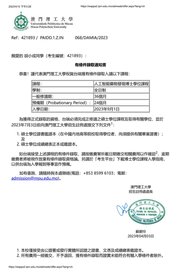 2022年12月份,胡小成在导师的鼓励下开始申请澳门理工大学的博士研究生,经过材料审查、第一轮面试、理论公式推导考核、第二轮面试和第三轮面试(全英文面试)等5轮考核,在激烈的竞争中脱颖而出,并获得了人工智能药物发现专业唯一的最高额奖学金,为公司争得了荣誉,也充分显示了公司的公司产品正向高水平发展。