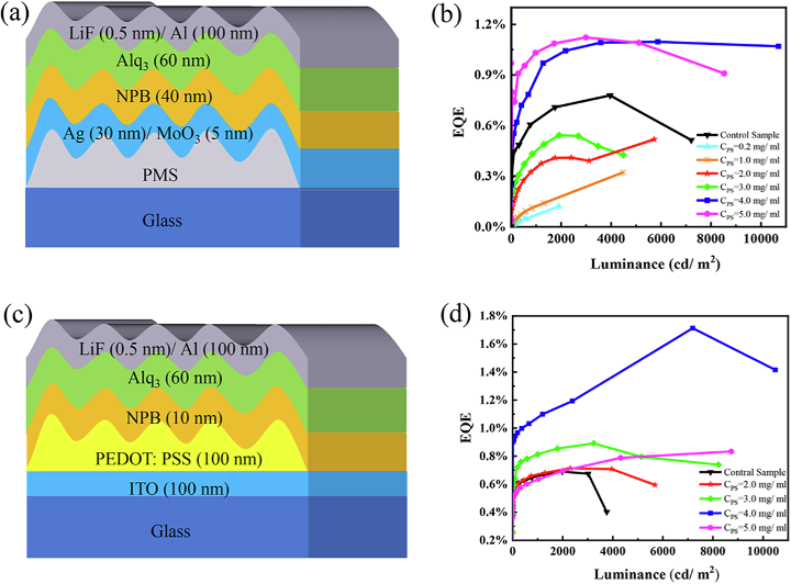 图(a, b)分别为双金属电极结构的OLED器件及其EQE与亮度的关系曲线:图(c, d)分别为纳米压印HTL的OLED器件结构及其EQE与亮度的关系曲线。
