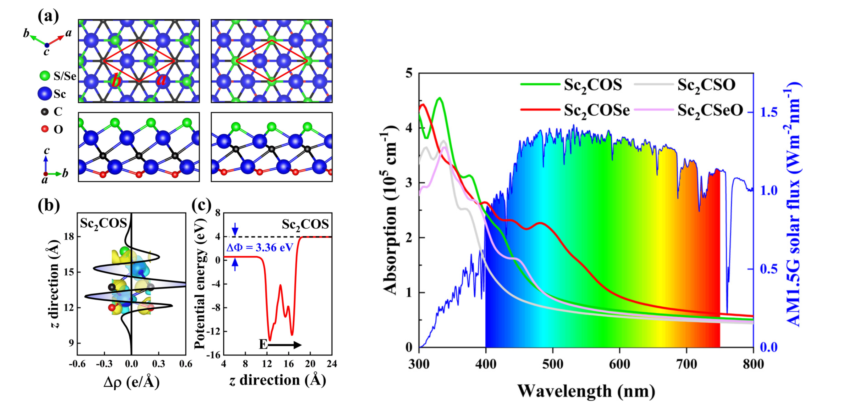 作者从理论上报道了四种候选光催化剂,即Sc2COS、Sc2CSO、Sc2COSe和Sc2CSeO。镜面不对称原子结构使Sc2COS在这些单层中具有7.53×109V/m的最大本征内建电场(EF),有利于光生电子-空穴对的分离。最大本征内建电场(EF)较小的Sc2CSO和Sc2CSeO是进行析氢反应的水分解半反应光催化剂。非常有趣的是,与顶部S或Se原子排列的C原子向下移动约0.40Å,并与底部O原子垂直排列,称之为内部垂直重构。因此,Sc2CSO(Sc2CSeO)重构转化为最大本征内建电场(EF)较大的Sc2COS(Sc2COSe),适用于光催化整体水分解。它们具有很大的光学吸收系数(高达105厘米-1)。该工作揭示了由内部垂直重构效应引起的最大本征内建电场(EF)增强促进水分子全分解的物理机制,这为理论上设计高效光催化剂提供了可行的策略。