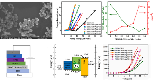 有机半导体激光在显示和照明领域有极大的潜在应用。降低有机增益介质的放大自发辐射(ASE)阈值和优化器件结构是实现电泵浦有机激光的关键因素。在这项工作中,我们将AgNPs以一定的体积比掺入PEDOT:PSS中,在研究光放大行为时,可以作为缓冲层;在研究OLED器件发光性能时,可以作为空穴传输层。研究表明:在AgNPs:PEDOT:PSS最佳体积比时,该缓冲层使得CBP:45 wt%BUBD-1混合膜的ASE阈值降低了6倍;在OLED器件中作为空穴传输层时,器件的亮度提高了1倍,最大外量子效率提高了近2倍。器件性能的提高,可以归因于AgNPs的局域表面等离子共振效应及由此导致的空穴迁移率提高。下图为部分实验结果图。