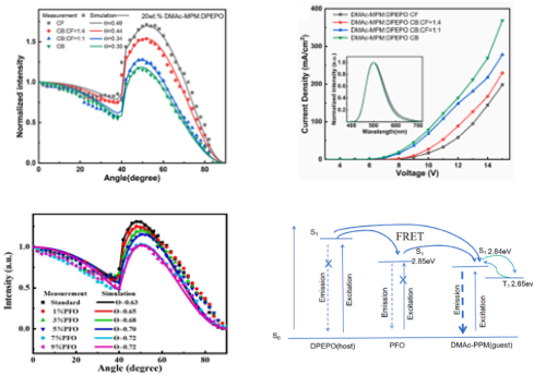 研究成果1以“Effect of solvent polarity on the performance of thermally activated delayed fluorescence OLEDs” (《溶剂极性对热活化延迟荧光OLED器件性能的影响》)为题,发表在《Dyes and Pigments》(《染料和颜料》,中科院二区,影响因子4.5)。该论文的第一作者为2019级硕士研究生生王帅(现为合肥工业大学博士研究生),2021级硕士研究生孙盈盈为共同第一作者。研究成果2以 “Enhanced performance of solution processed OLED devices based on PFO induced TADF emission layers” (《PFO作为取向诱导剂提高溶液法制备OLED器件的性能》),发表在《Journal of Luminescence》(《发光学报》,中科院二区,影响因子3.6 )。该论文第一作者为2021级硕士研究生孙盈盈。