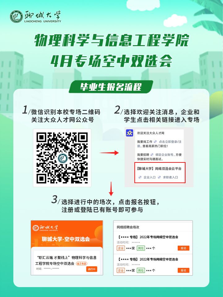 手机微信扫码关注“大众人才网”微信公众号,企业和毕业生分别点击相关按钮进入beats365唯一官网入口官网专场,点击本公司报名按钮,注册或登录已有账号即可直接参与。